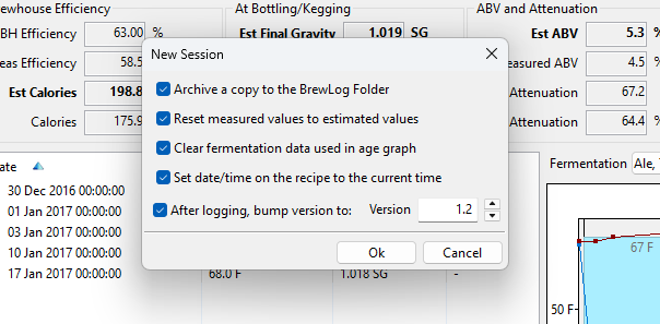 The idea here is when you have completed a brewing session and recorded any fermentation/measurements and notes you can click this button and it will archive a copy of the recipe to your brew log, reset your measured values to estimated, clear the fermentation data, reset the recipe date to today and finally bump the version number on the recipe to the next version. This way your Brew Log folder has a copy of all of the recipes you have brewed along with correct dates, version numbers and the recorded data.